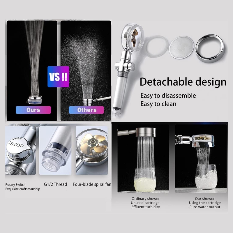 Diseño especial de hélice: potente modo de agua de chorro, flujo de agua para turbocarga de turbina eólica, que puede ayudar a limpiar rápidamente la espuma del cuerpo. También es una excelente opción para duchas de mascotas. Y todo esto se puede lograr con un solo botón.