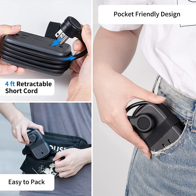 Cable de extensión corto envolvente de 4 pies: el cable de extensión retráctil flexible de 4 pies envuelve inteligentemente el cuerpo y se conecta a un enchufe de CA para un almacenamiento limpio. Ideal para viajes y viajes de negocios, es para ahorrar espacio en casa o en tu bolsa de viaje. La comodidad adicional del práctico enchufe plano de ángulo recto de 45° permite que tus muebles se sientan al ras de la pared, creando más espacio sin cables doblados.