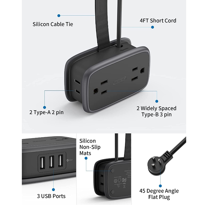 Regleta de alimentación de viaje 7 en 1 con USB: la tira de alimentación USB NTONPOWER convierte una toma de corriente en 7, incluyendo dos tomas de corriente de 3 clavijas, dos tomas de corriente de 2 clavijas y 3 puertos USB que cargarán la mayoría de smartphones, tabletas, portátiles, altavoces Bluetooth y otros dispositivos. 2 salidas de CA ampliamente espaciadas pueden acomodar adaptadores de corriente más grandes, como batería de cámara de gran tamaño y enchufes de cargador, sin bloquear las otras tomas.